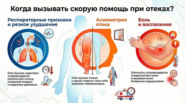 | Отек одной руки или ноги | Тромбоз глубоких вен (нужна срочная медицинская помощь), лимфедема | Односторонний отек всегда опасен, особенно если сопровождается болью, покраснением, локальным повышением температуры |