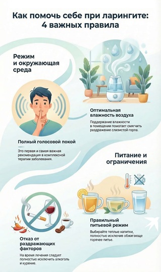 - Современный подход в лечении ларингита ставит на первое место заботу о голосовых связках – им надо дать покой, в идеале организовать режим молчания и комфортную атмосферу с хорошо увлажненным воздухом.
