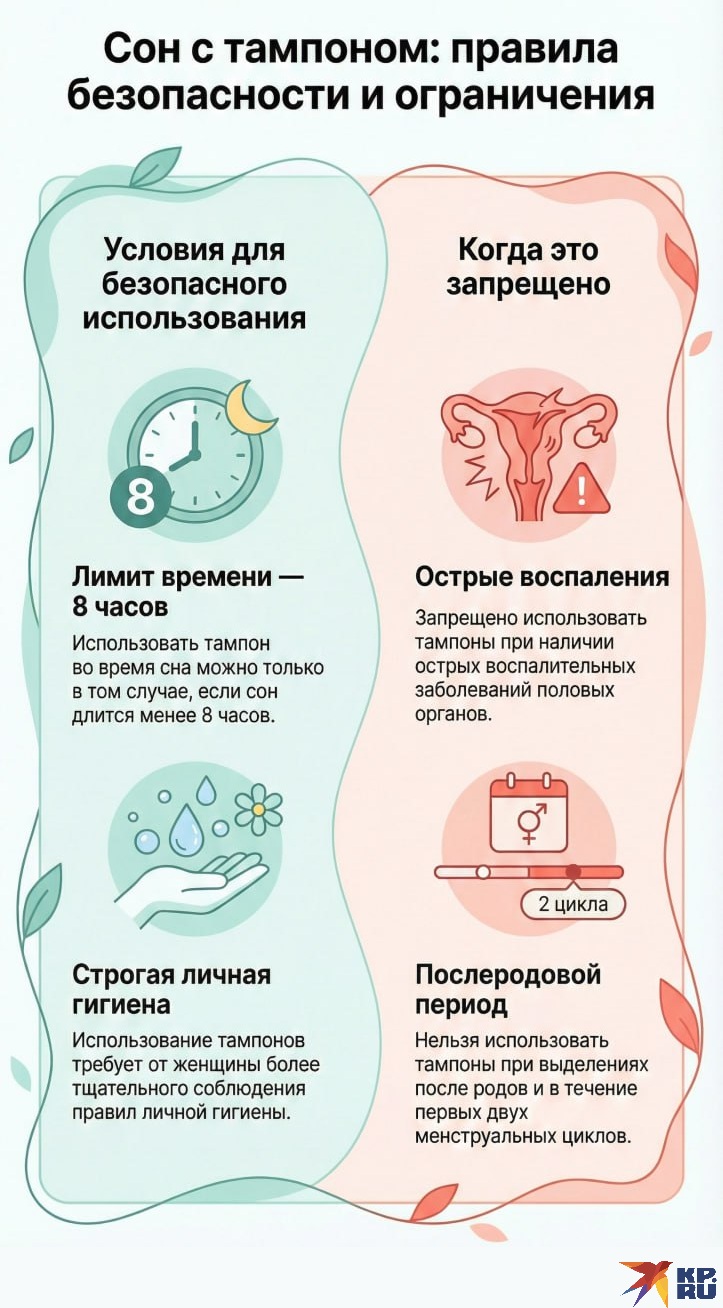 | Можно ли спать с тампоном? | Можно, если сон длится менее 8 часов |