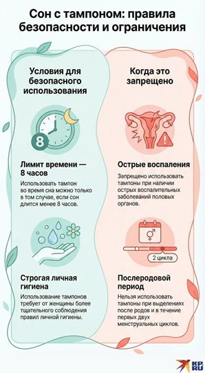 | Когда спать с тампоном нельзя? | При острых воспалительных заболеваниях половых органов, при выделениях после родов и в первые два менструальных цикла |