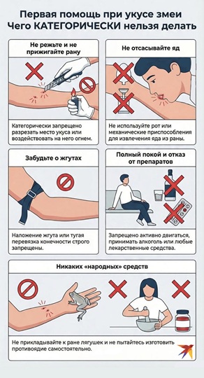 Руководитель Школы первой помощи «Просто и правильно» Павел Ильин подчеркивает, что оказание первой помощи при укусе змеи будет заключаться в одной и той же последовательности (универсальном алгоритме оказания первой помощи), где приоритет отдается обеспечению безопасных условий оказания первой помощи, а все дальнейшие действия будут направлены на поддержание состояния человека до прибытия скорой медицинской помощи.
