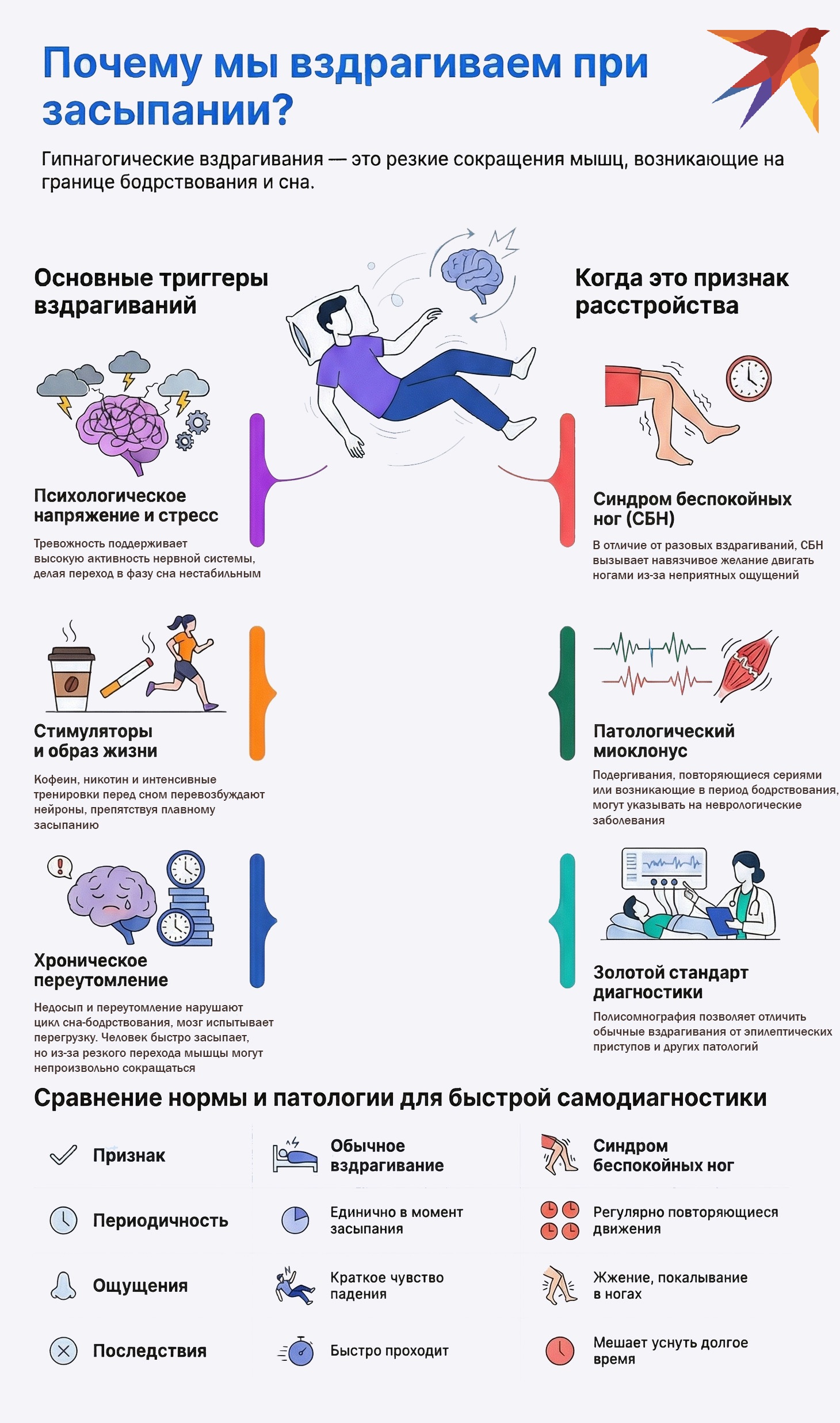 Это важный признак: нормальные гипнагогические вздрагивания не вызывают стойкой бессонницы.