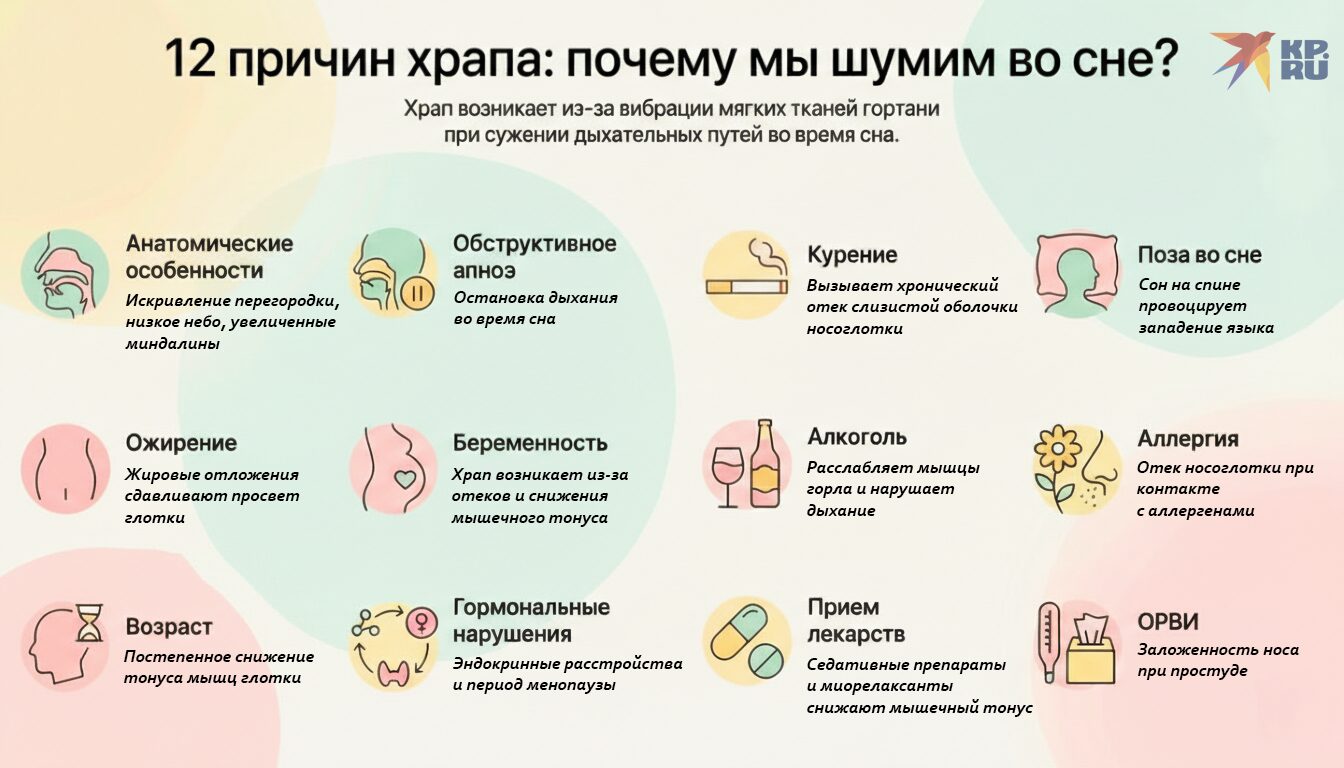 | Частые причины храпа | • анатомические особенности; • возраст; • обструктивное апноэ; • вредные привычки; • положение во время сна |