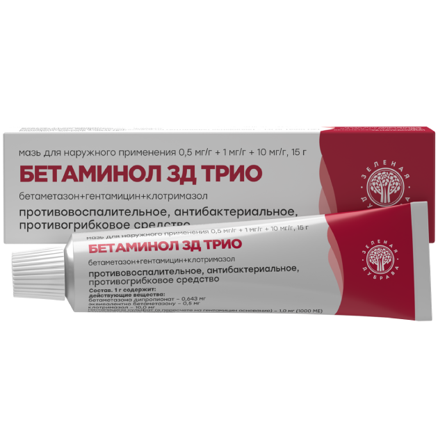 Комбинированное средство БЕТАМИНОЛ ЗД ТРИО оказывает противоаллергическое, противовоспалительное, антибактериальное и противогрибковое действие. Мазь помогает бороться с отеком и воспалением, уменьшать зуд и покраснение кожи, а также применяется при бактериальных и грибковых инфекциях кожи. Подходит для взрослых и детей с 2 лет.