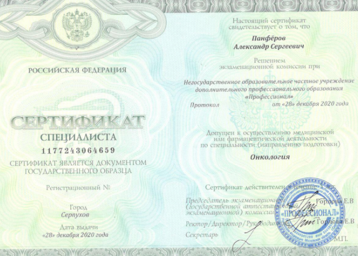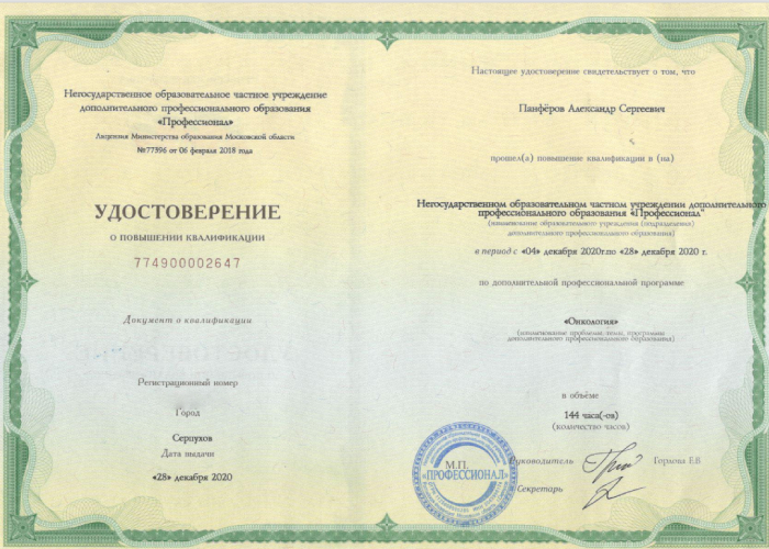 2018 г. - Новосибирский государственный медицинский университет (онкология). Циклы переподготовки.
