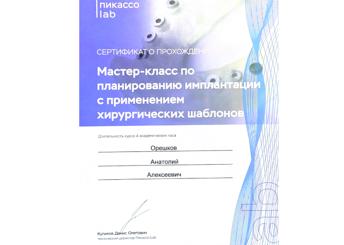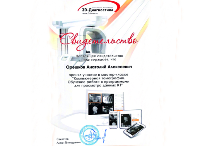 2018 г. – ФГБОУ ВО Саратовский ГМУ им. В.И. Разумовского Минздрава России. Аккредитация специалиста «Стоматолог общей практики».