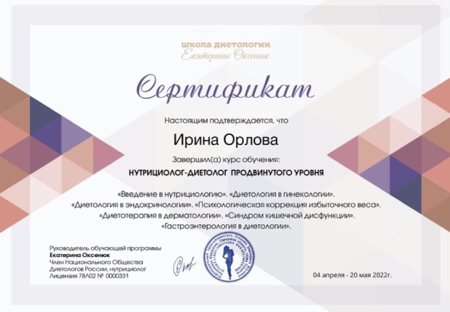 Врач-нутрициолог, преподаватель курса «Стройнеть правильно» в АНО Всероссийская социально-образовательная организация «Учусь в сети». Закончила Ярославскую государственную медицинскую академию, интернатуру по терапии в ГКБ N 1 им. Пирогова, ординатуру по ревматологии в НИИ ревматологии РАМН.