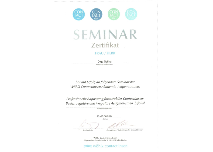 2014 г. – «Профессиональная адаптация контактных линз осесимметричных, при регулярном и нерегулярном астигматизме, бифокальных», Германия.