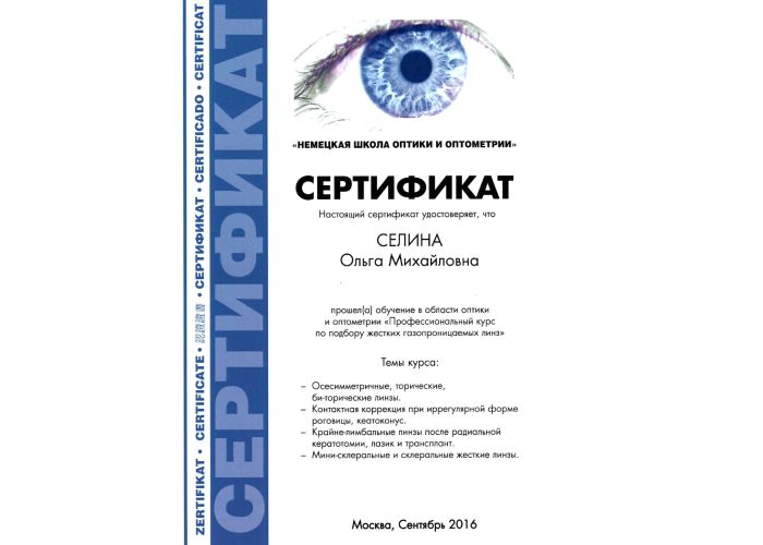 2016 г. – «Профессиональный курс по подбору жестких газопроницаемых контактных линз», г. Москва.