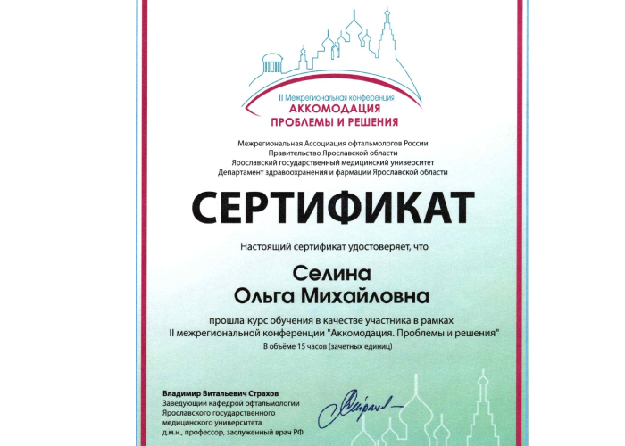 2015 г. – «Ортокератология», НОЧУ ДПО «Академия медицинской оптики и оптометрии», г. Москва.