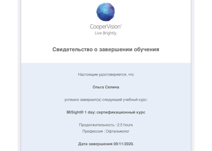 2020 г. – «MiSight 1 day: сертификационный курс» КуперВижн, г. Москва.