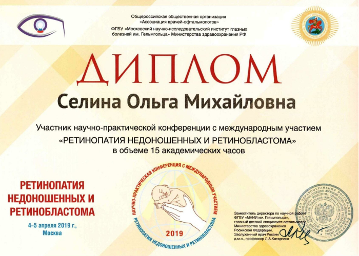 2019 г. – «Ретинопатия недоношенных и ретинобластома», г. Москва.