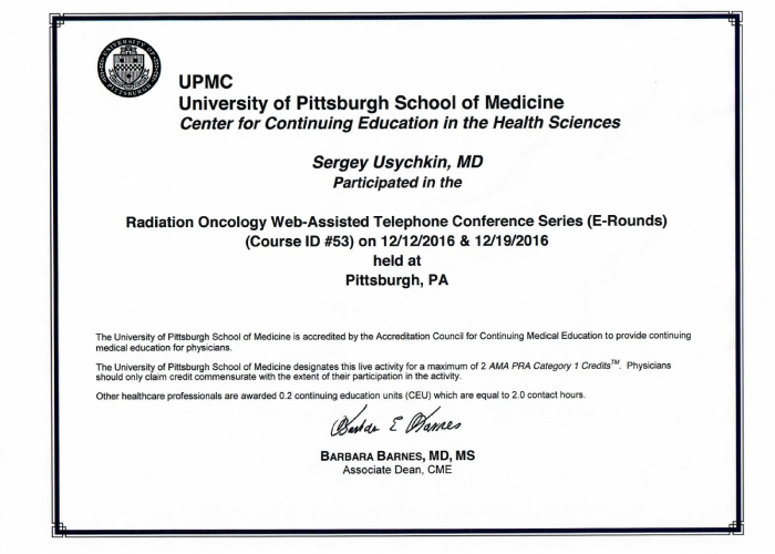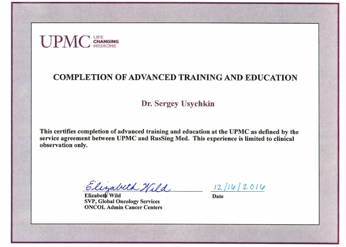 2017 г. – профессиональная переподготовка по специальности «Радиотерапия» на кафедре ФГБОУ ВО РНИМУ им. Н.И. Пирогова Минздрава России, 504 часа.