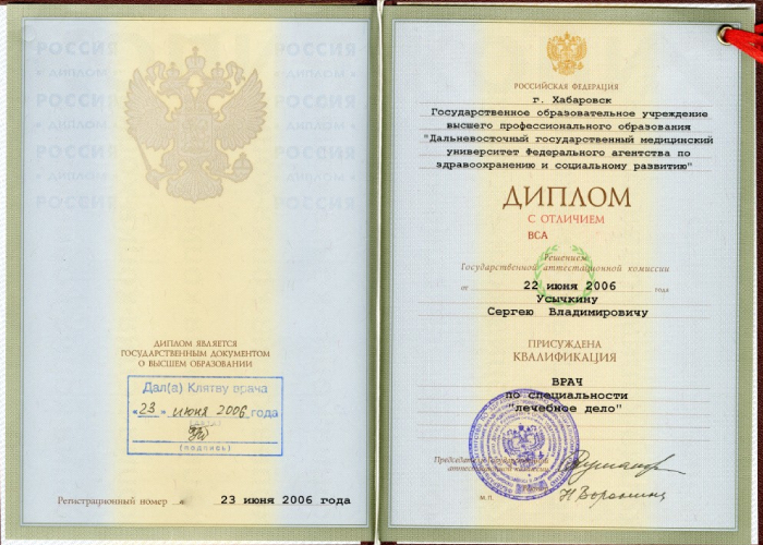 2006 г. - врач по специальности «Лечебное дело». Дальневосточный государственный медицинский университет. Лечебный факультет. Хабаровск, Россия.