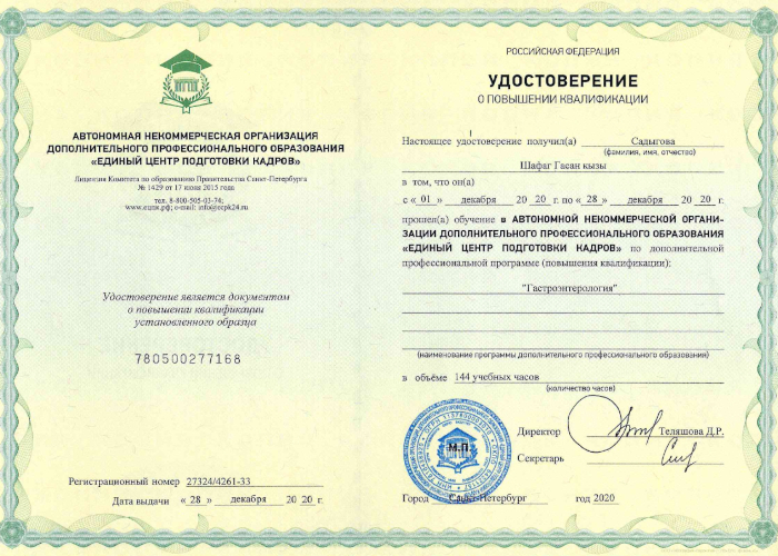 2020 г. - Единый центр подготовки кадров (гастроэнтерология). Повышение квалификации.
