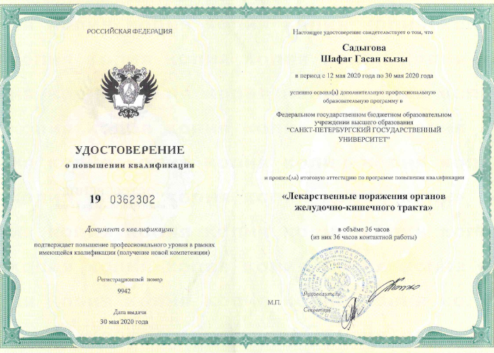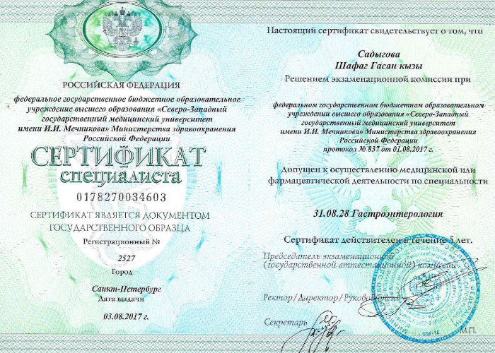 2017 г. - Северо-Западный государственный медицинский университет им. И.И. Мечникова (гастроэнтерология). Ординатура.