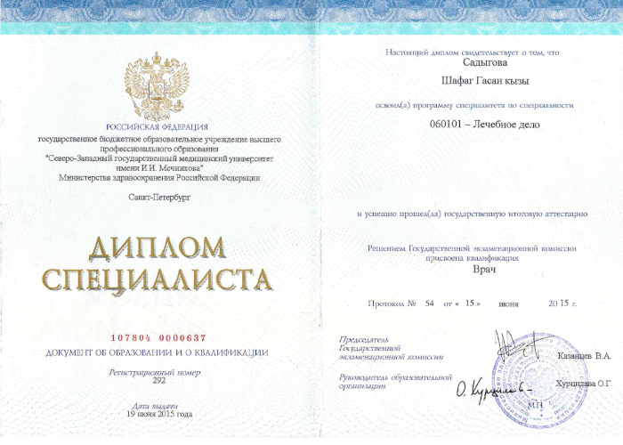 2015 г. - Северо-Западный государственный медицинский университет им. И.И. Мечникова (лечебное дело). Базовое образование.
