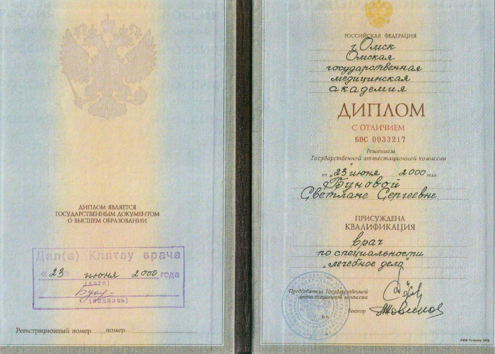 2000 г. - Омская государственная медицинская академия (лечебное дело). С отличием. Базовое образование.