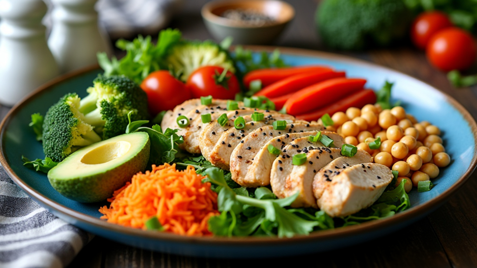 Обед: отварное куриное филе с овощами (брокколи, помидоры, цветная капуста), соль и пряности по вкусу