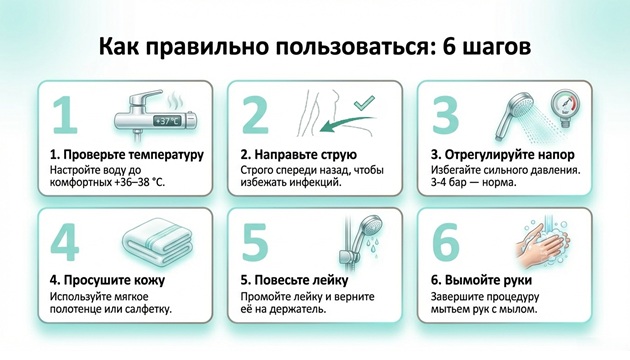 Струю воды из лейки нужно направлять спереди назад – это стандартное правило гигиены. Соблюдение этого правила особенно важно для женщин. Если струя воды идет в обратном направлении (сзади наперед), высок риск перенести бактерии из области ануса в область влагалища и уретры, что чревато развитием инфекционно-воспалительных заболеваний2.