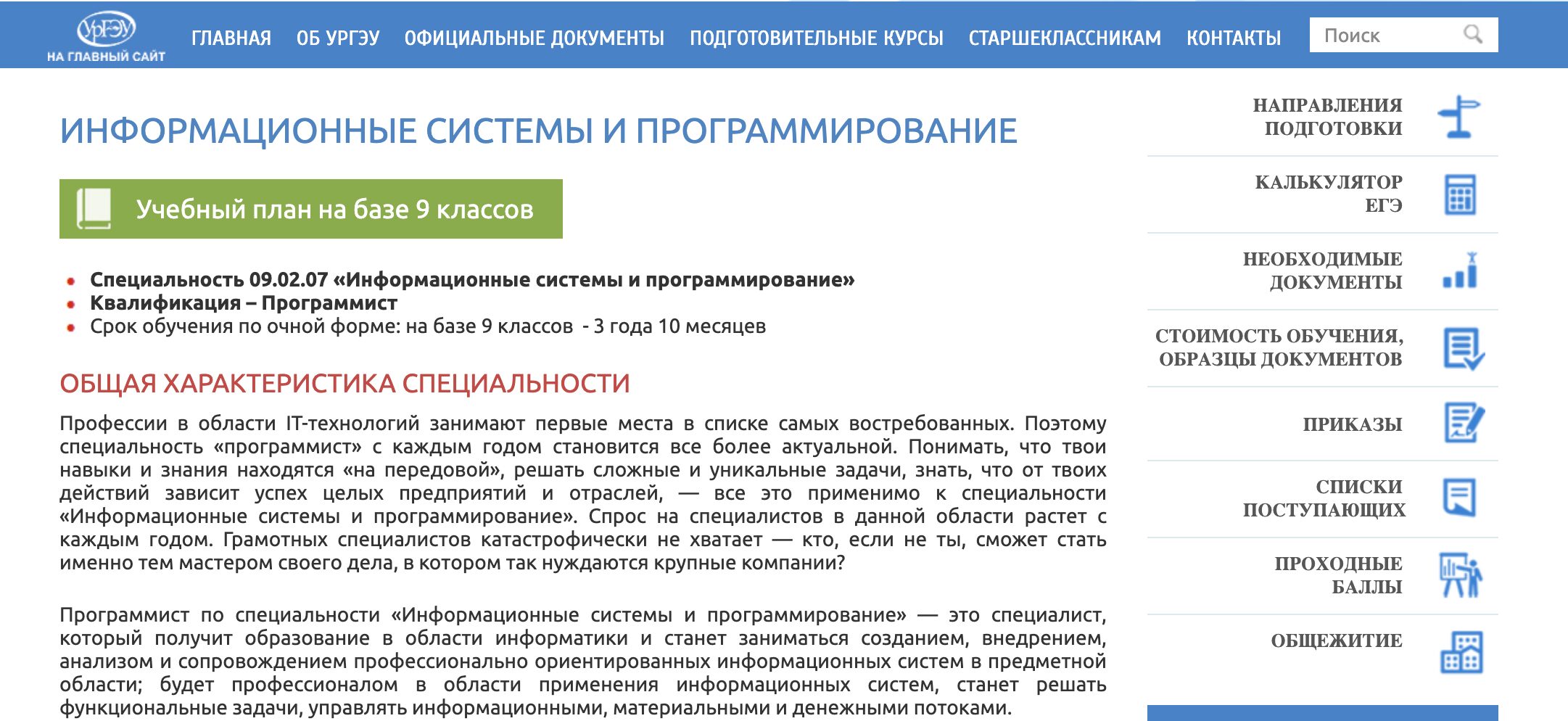 Колледж входит в структуру Уральского государственного экономического университета. Сразу после 9 класса вы можете поступить на очную программу «Информационные системы и программирование». Проходной балл для поступления на бюджет в 2024 году составил 4,76, на платные места — 4,45. При этом бюджетных мест предусмотрено 15, и еще 12 учебных мест оплачиваются гражданами самостоятельно. Допускается использование образовательного кредита.