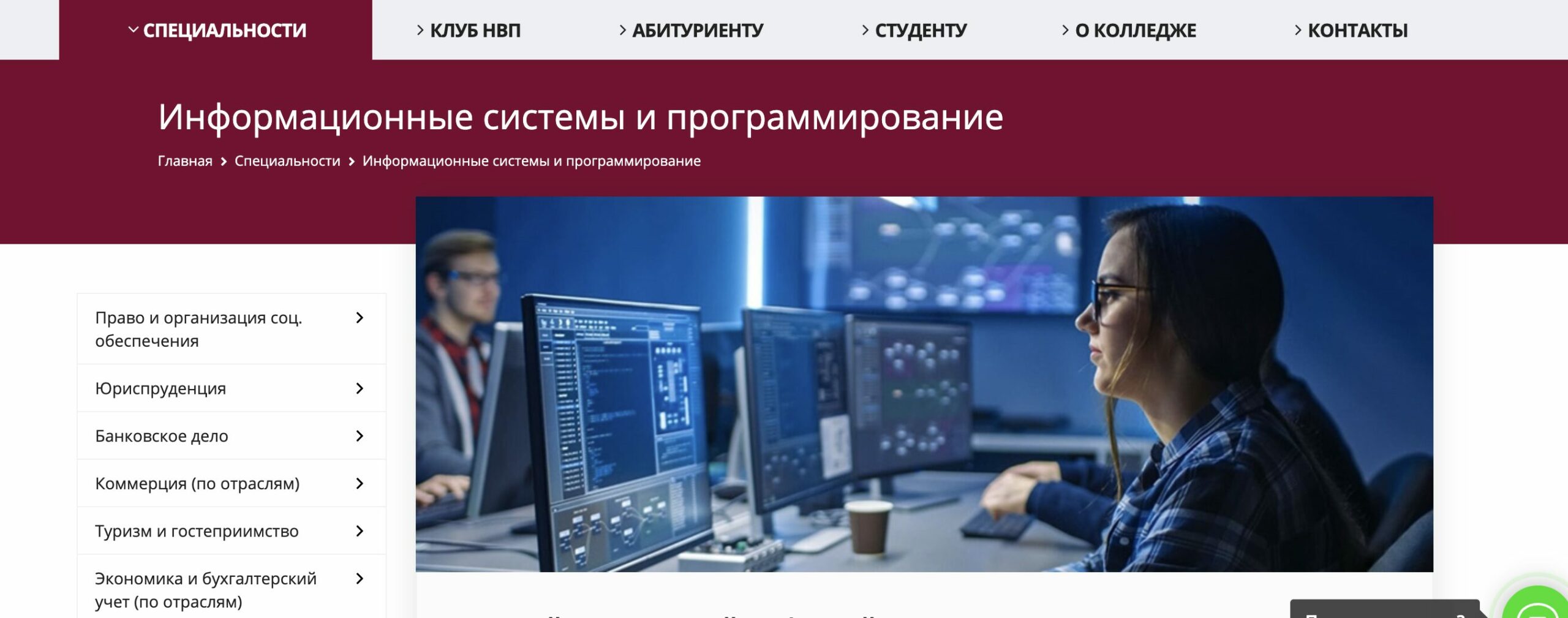 Современный колледж готовит специалистов самых востребованных профессий. И это не только швеи, парикмахеры, визажисты и другие специалисты в области красоты и эстетики. В колледже также есть специальность «Информационные системы и программирование» с очным обучением на бюджетных (50) или внебюджетных (20) местах. Учебное заведение развивается в ногу со временем и потому постоянно совершенствует методику подготовки экономистов, управленцев, программистов, расширяя международные связи с ведущими учебными и научными центрами.