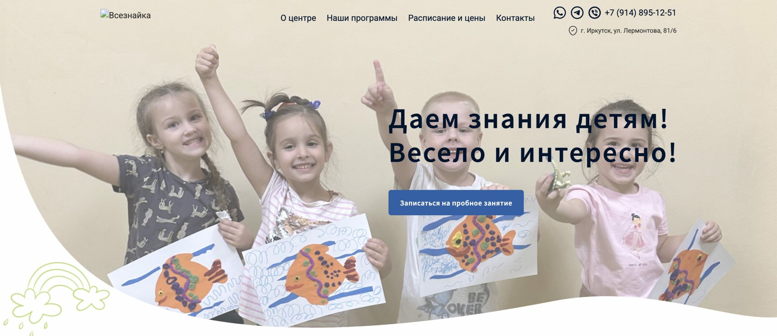 «Всезнайка» учит малышей и школьников через игру и творчество. Для детей от 9 месяцев до 4 лет проводят комплексные занятия: развивают память, внимание, речь, мелкую моторику и готовят руку к письму. Каждое занятие длится 45 минут и превращается в сказку, где ребенок становится главным героем.