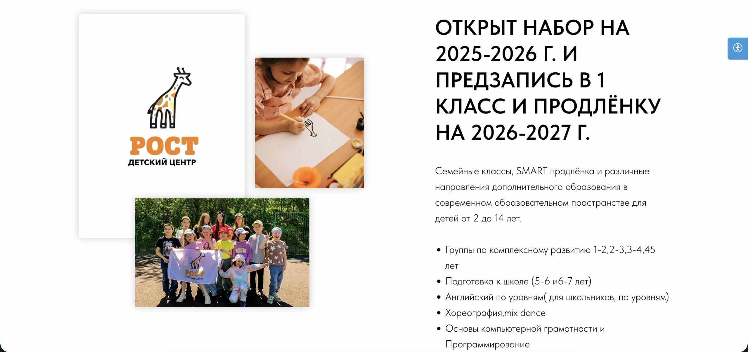 В «Росте» малыши посещают группы комплексного развития. Дошкольники занимаются подготовкой к школе, английским языком, хореографией, рисованием, декоративно‑прикладным искусством и курсами по эмоциональному интеллекту. Для школьников открыты занятия по программированию, компьютерной грамотности и спортивные секции.