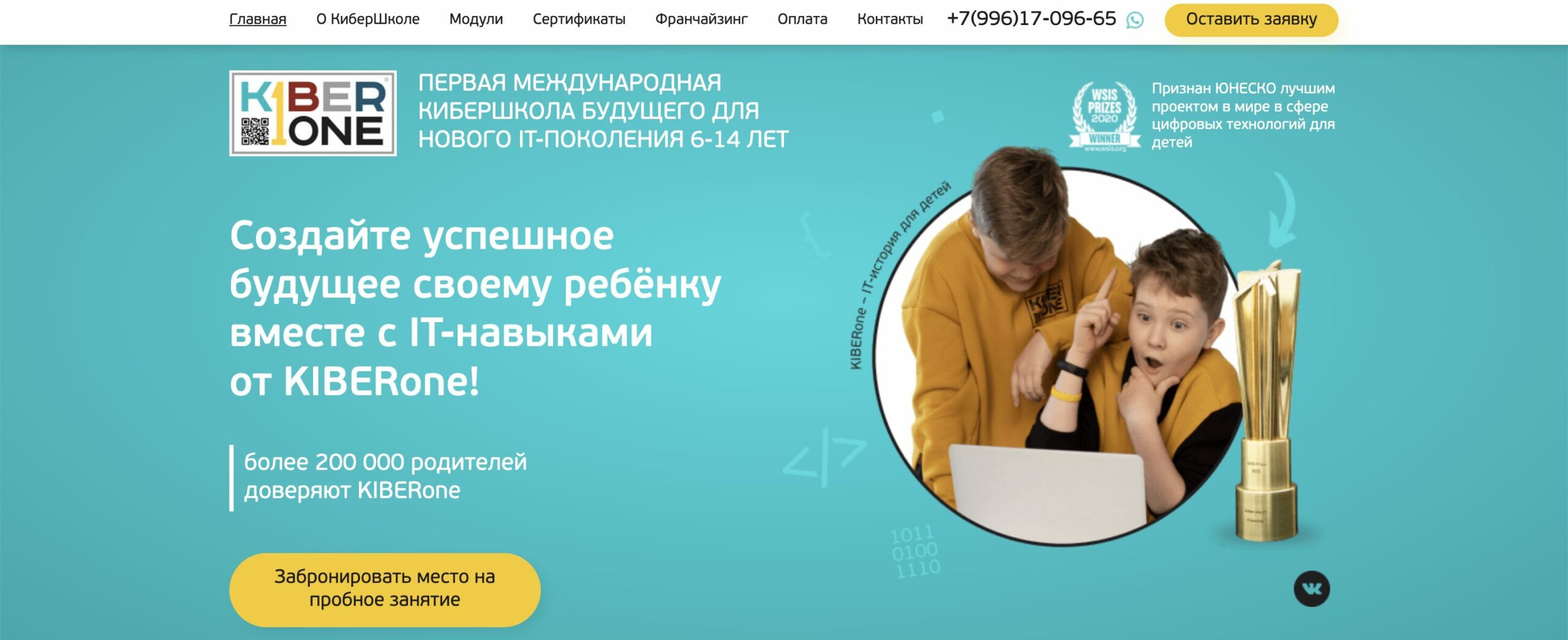 Школа программирования KIBERone принимает учеников от 6 до 14 лет. Здесь проводят занятия по программированию и графическим редакторам, 3D-моделированию, кибербезопасности, блокчейну, виртуальной реальности, искусственному интеллекту и даже учат создавать интернет-магазины и сайты. Учащихся делят на группы по 12 человек, где уроки им проводят программисты с опытом работы от трех лет. По выходным гостям проводят бесплатные часовые мастер-классы.