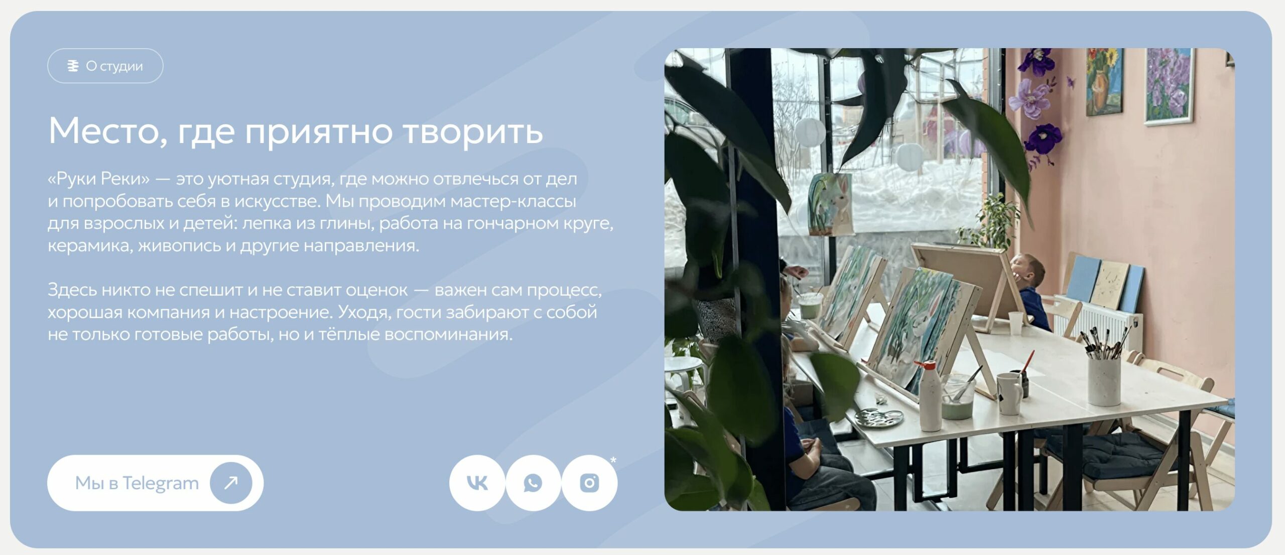 В студии творческого развития проходят занятия по гончарному ремеслу, керамике, живописи и другим направлениям. Заниматься можно индивидуально или в группе. Обучение проходит в форме мастер-классов. Расслабленная атмосфера позволяет ученику погрузиться в процесс и научиться лепить из глины, работать на гончарном круге, освоить тонкости живописи — здесь никто не ставит оценок, важен исключительно результат. А результат — это не только полученные навыки, но и хорошее настроение и теплые воспоминания о времени, проведенном в уютной компании единомышленников.