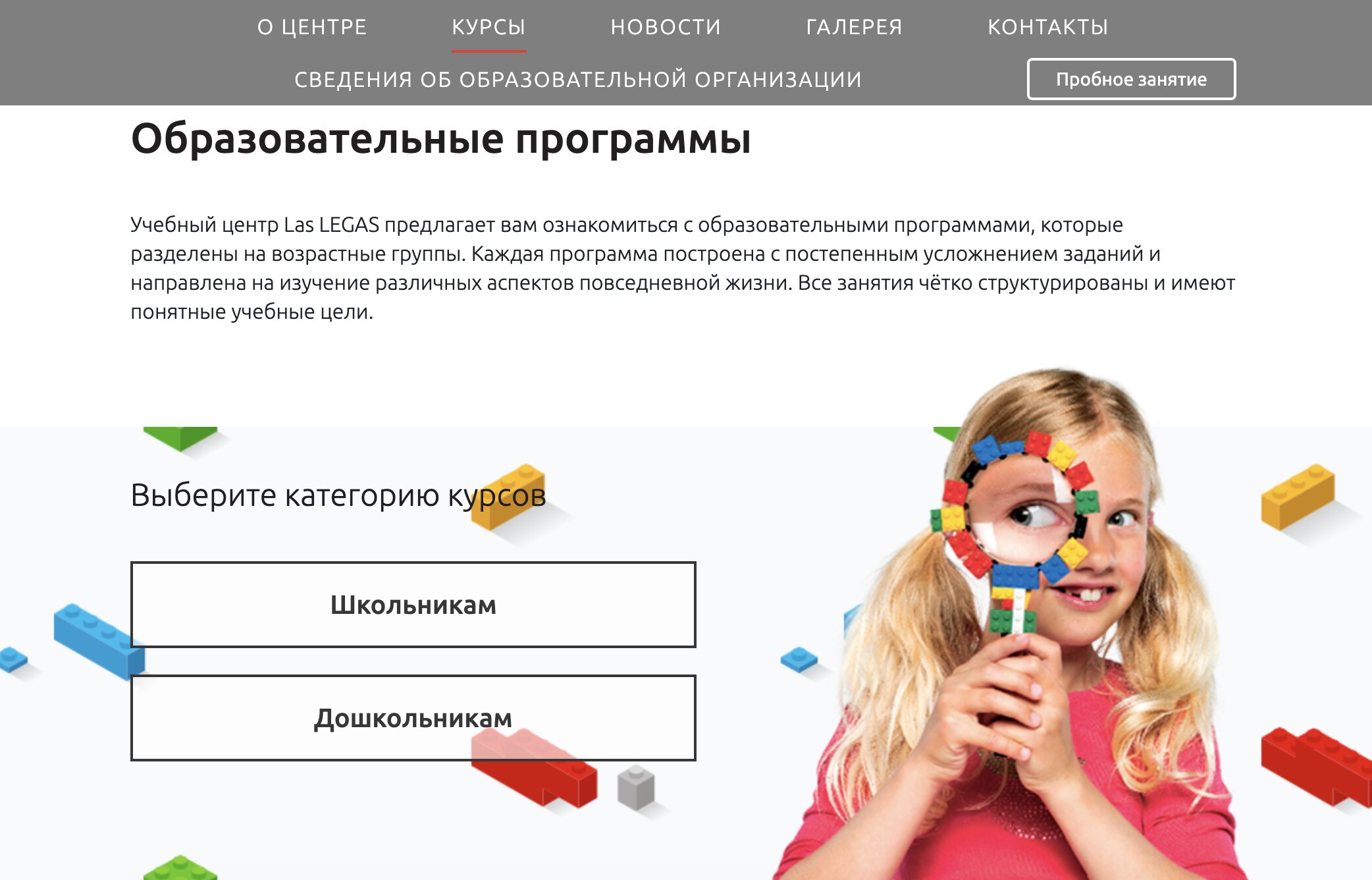 В учебном центре предусмотрены различные образовательные программы для детей, они разделены по возрастам и нацелены на обучение различным аспектам жизни. Образование в области робототехники можно начинать с двухлетнего возраста. В Las LEGAS есть программа для детей 2–3 лет «Конструктор 2+». На занятиях малыши по образцу, показанному педагогом, конструируют свои проекты, отвлекаясь на массажные, музыкальные и игровые перерывы. Также предусмотрены программы для детей 4, 5, 6 лет — с постепенным усложнением заданий.