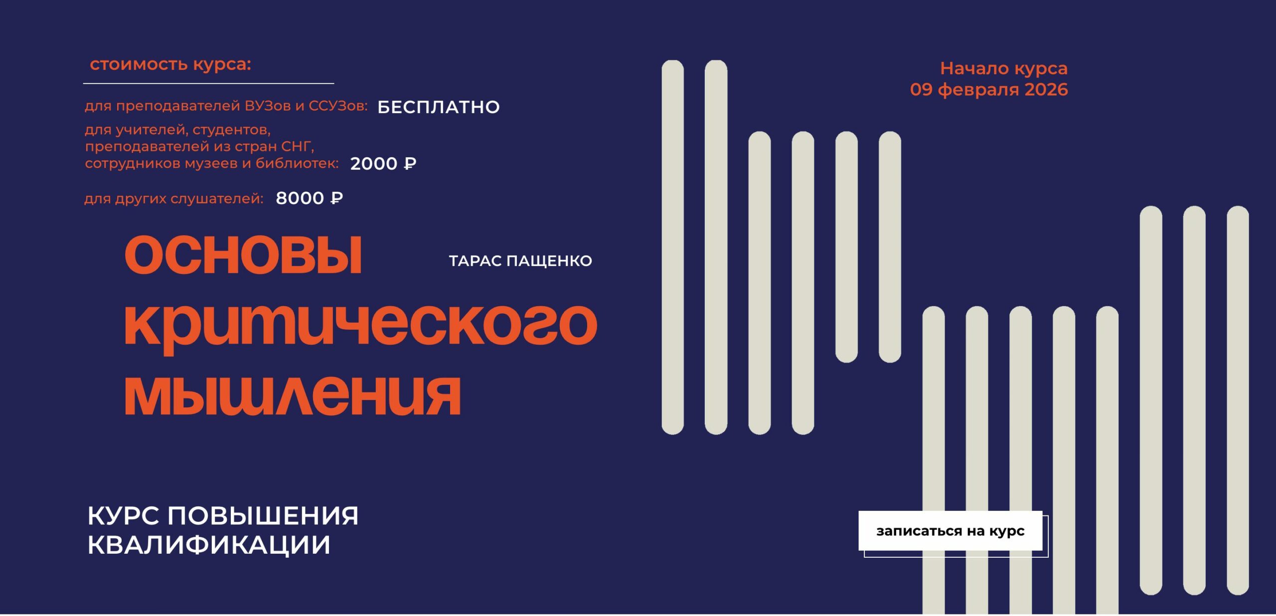 Автор курса Тарас Пащенко расскажет, как преодолевать когнитивные искажения, строить силлогические рассуждения и проверять их на корректность, дискутировать и оценивать аргументы. Успешно освоившие программу получают удостоверение о повышении квалификации, выдаваемое Благотворительным фондом Егора Гайдара.