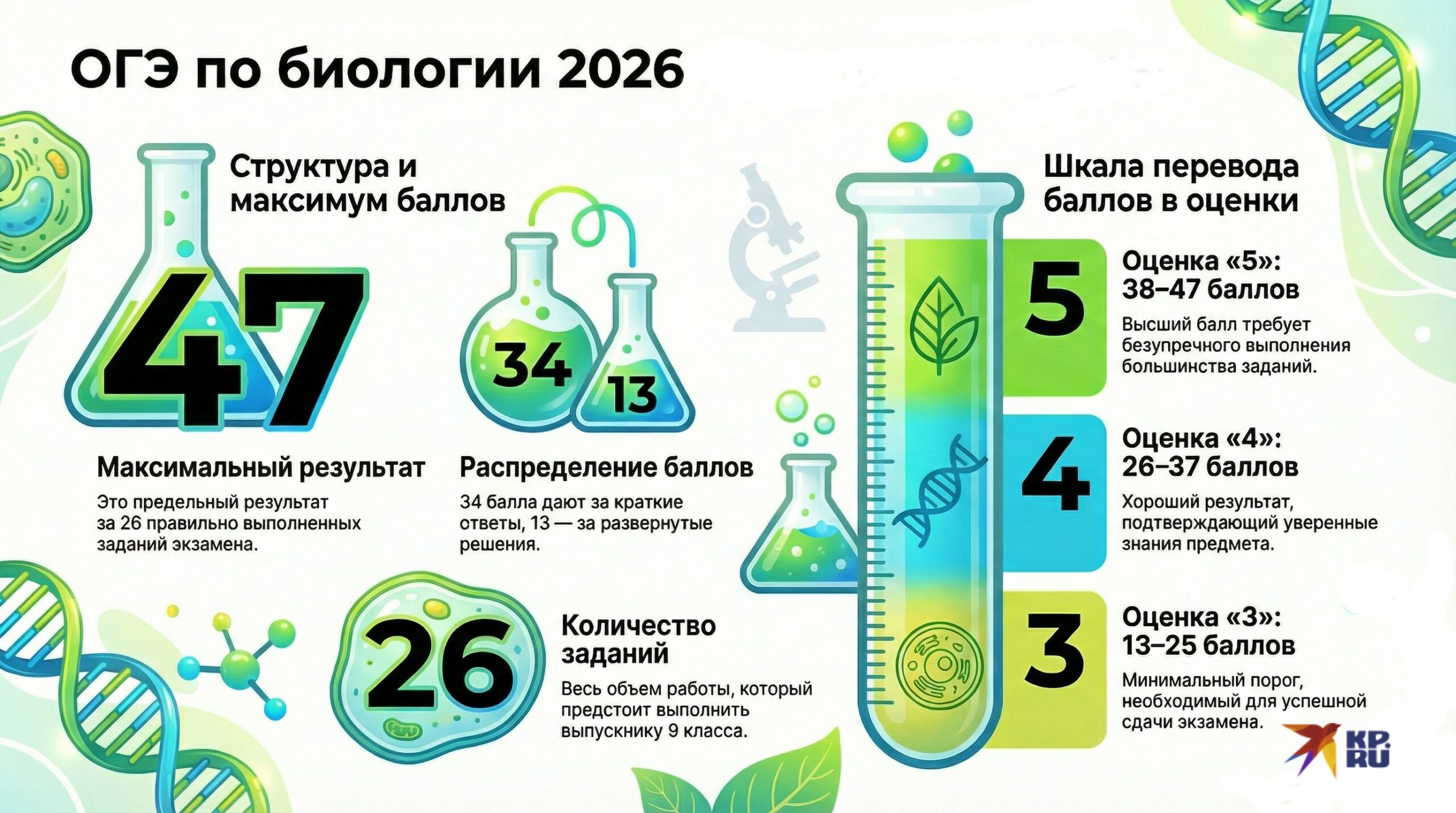 В ОГЭ по биологии можно набрать 47 баллов, которые ученик получит, выполнив правильно все 26 заданий. 13 из них дают за верно выполненные задания с развернутым ответом, остальные 34 – за задачи с кратким ответом (в виде слова или словосочетания, цифр, набора цифр или букв).