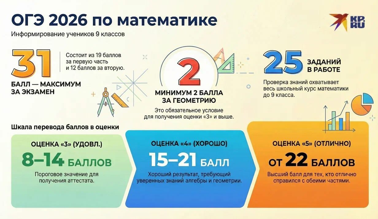 Максимально за ОГЭ по математике в 2026 году можно получить 31 балл: 19 за первую часть и 12 за вторую. При этом за ответы на задания с №20 по №25 можно получить от 0 до 2 баллов: если допущена вычислительная или терминологическая ошибка, но общий ход рассуждений верен, ученик получит только 1 балл.