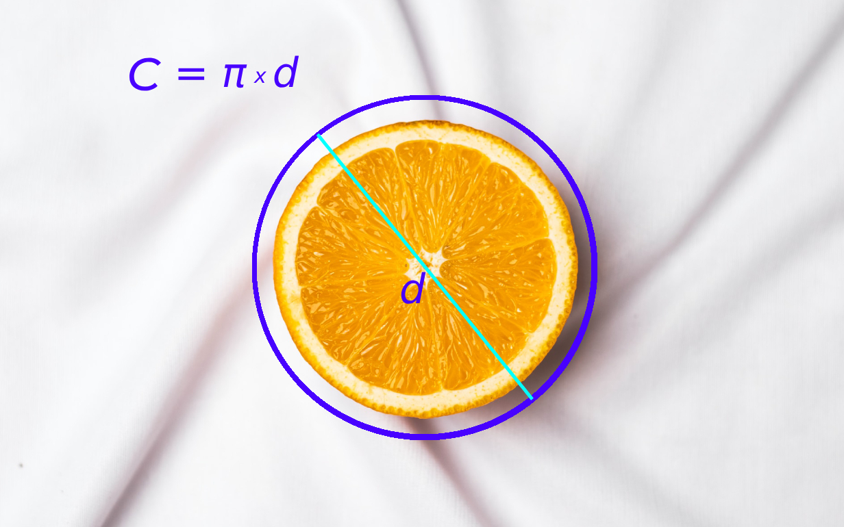 Если нам известен диаметр окружности, то длину окружности можно посчитать, умножив число π на диаметр. Диаметр окружности – это отрезок, соединяющий две точки на окружности, проходящий при этом через центр окружности.