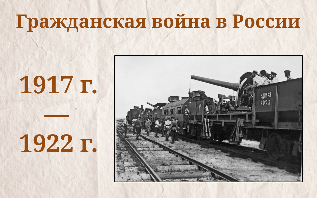 Гражданская война — это длительный внутренний конфликт между разными общественными группами, принявший характер вооруженного противоборства. В России борьба за власть в рамках Гражданской войны велась между силами Рабоче-Крестьянской Красной Армии (РККА) и Белого движения. Конфликт обострялся повстанческими вспышками на национальных окраинах бывшей империи, которые были не выгодны ни сторонникам большевизма, так как они хотели принудительно распространить свою идеологию как можно дальше и нуждались в контроле над обширными территориями, ни противникам-белогвардейцам, выступавшим за «единую и неделимую Россию». Вмешательство иностранных интервентов подогревало конфликт и продлевало его срок финансовой поддержкой.