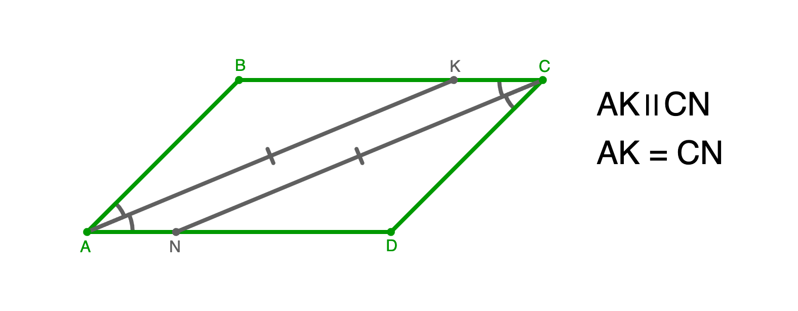 Если ABCD — параллелограмм, AK — биссектриса угла A, CN — биссектриса угла C, K и N — точки пересечения биссектрис с соответствующими сторонами (или их продолжениями), то AK॥CN и AK = CN.
