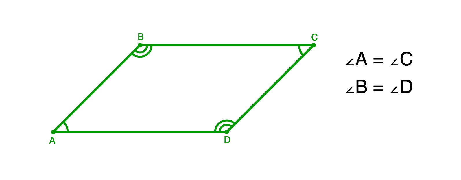 Если ABCD — параллелограмм, то ∠A = ∠C, ∠B = ∠D.