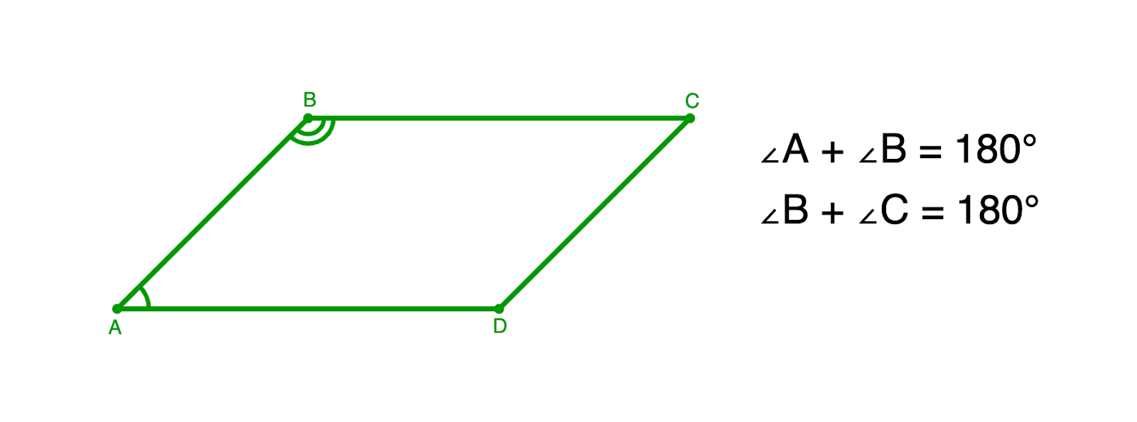 Если ABCD — параллелограмм, то ∠A + ∠B = 180°, ∠B + ∠C = 180°.
