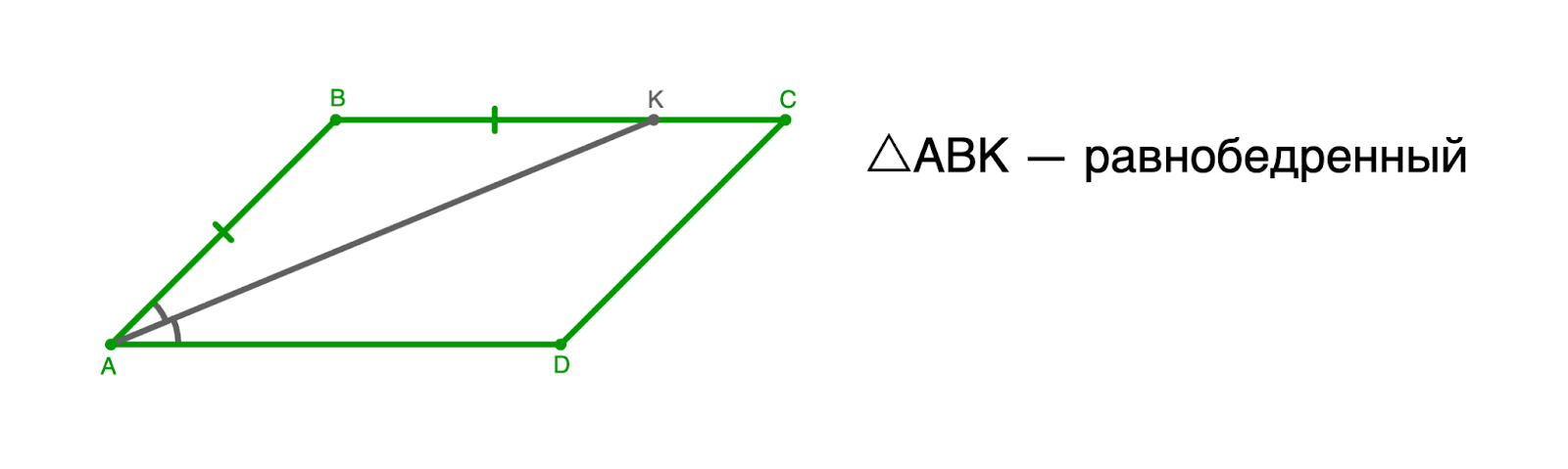 Если ABCD — параллелограмм и AK — биссектриса угла A, а точка K лежит на стороне BC, то △ABK — равнобедренный.