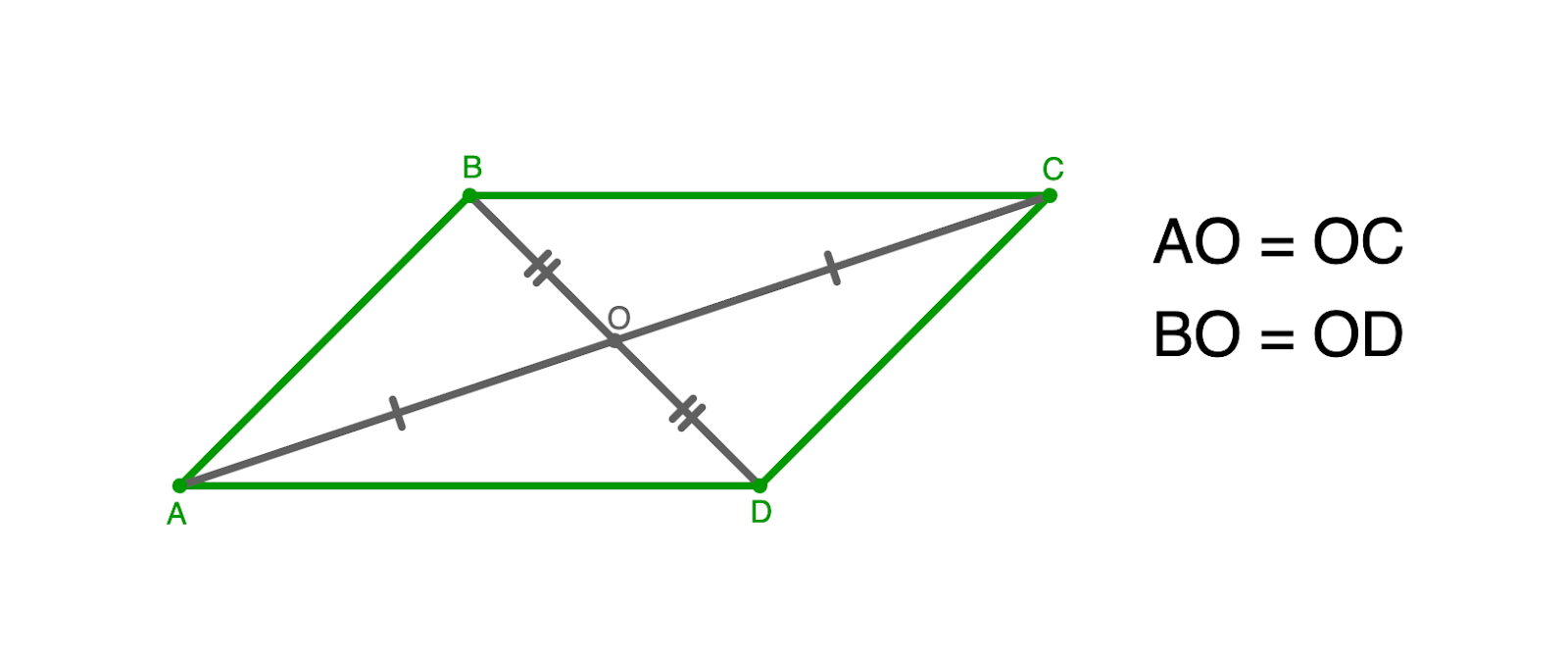 Если ABCD — параллелограмм и O — точка пересечения диагоналей, то AO = OC, BO = OD.
