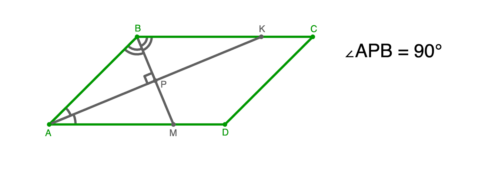 Если ABCD — параллелограмм и P — точка пересечения биссектрис углов A и B, то ∠APB = 90°.