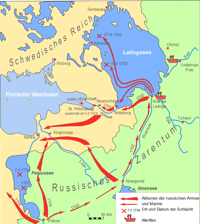 Далее последовал ряд побед русских войск: 30 декабря 1701 года — в битве при Эрестфере; июль 1702 года — успех у Гуммельсгофа. К лету 1703 года в результате нескольких победоносных штурмовых операций русские войска заняли практически весь берег Невы (16 мая 1703 года — основание Петром Санкт-Петербурга), а к концу 1703 года захвачена почти вся Ингерманландии.