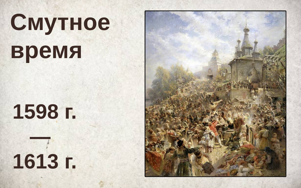 Смутное время — это период глубокого кризиса в России в конце XVI – начале XVII века. Во время него страна столкнулась с голодом, экономическим коллапсом, гражданскими войнами и иностранной интервенцией.