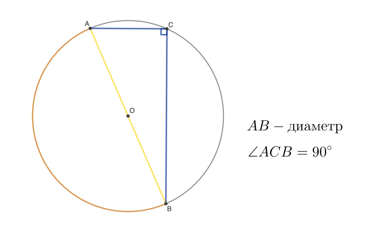 Вписанный угол, опирающийся на диаметр, прямой. И наоборот, вписанный угол, равный 90°, опирается на полуокружность.