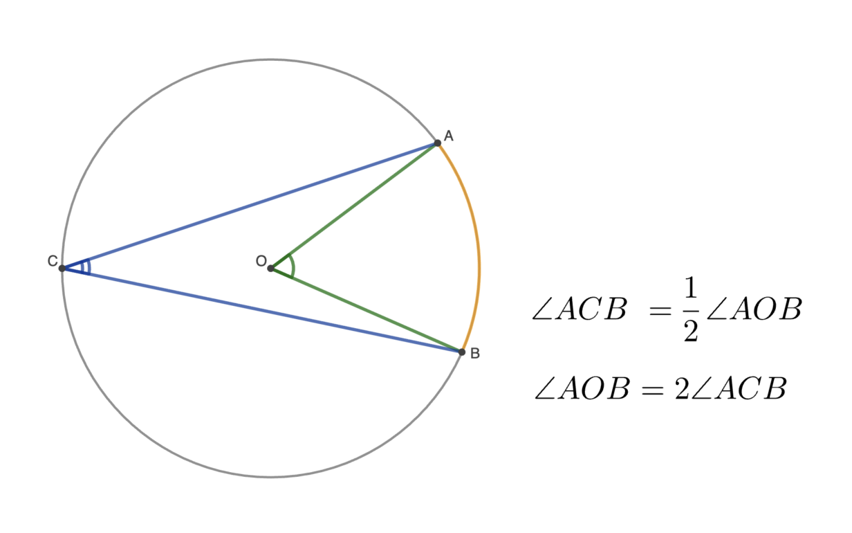 Вписанный угол равен половине центрального угла, опирающегося на ту же дугу, и наоборот.