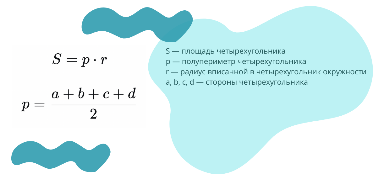 3. Площадь описанного четырехугольника равна произведению его полупериметра на радиус вписанной окружности:
