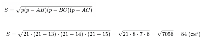 p = (13 + 14 + 15) / 2 = 21 (см)