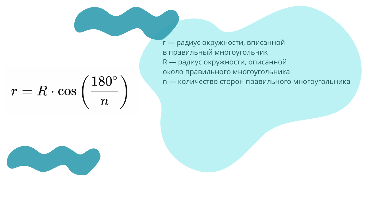 Эти формулы выводятся из рассмотрения прямоугольного треугольника, образованного радиусом вписанной окружности (апофемой), половиной стороны многоугольника и радиусом описанной окружности.