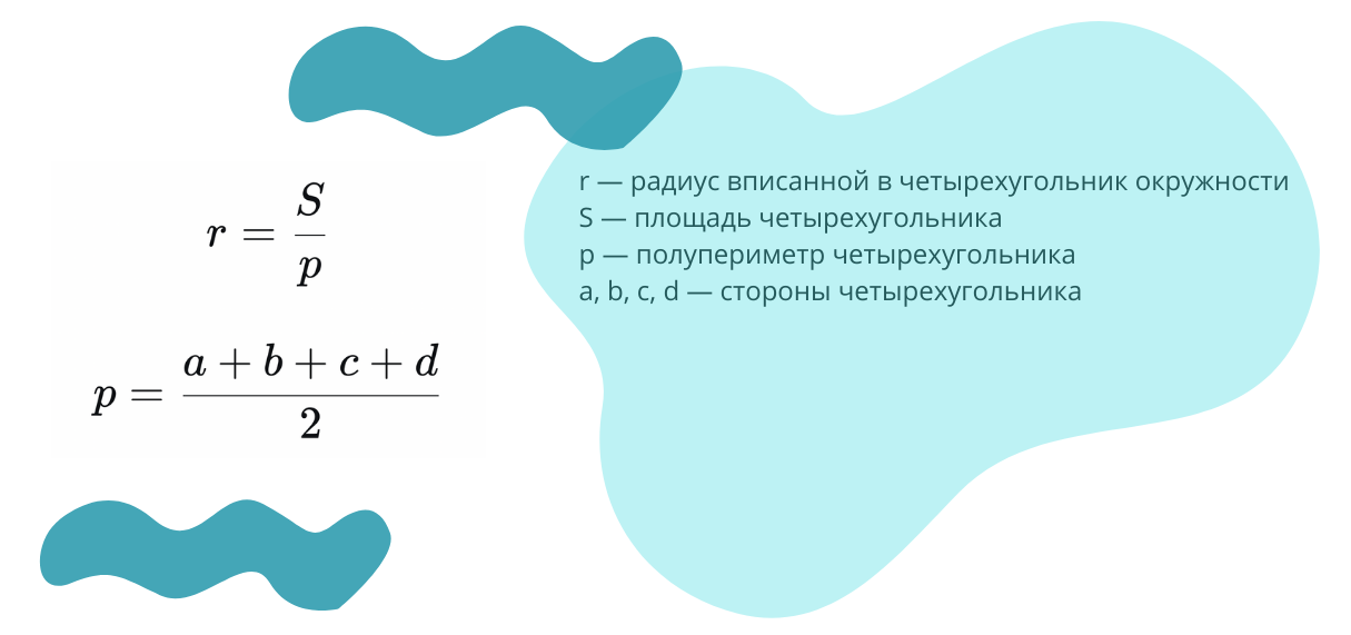 4. Радиус вписанной в четырехугольник окружности можно найти, поделив площадь четырехугольника на полупериметр: